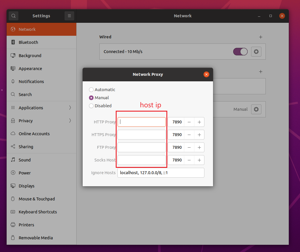 手动配置 Network Manual 模式,填入宿主机ip和代理软件端口(clash默认端口7890,V2具体端口看软件界面)