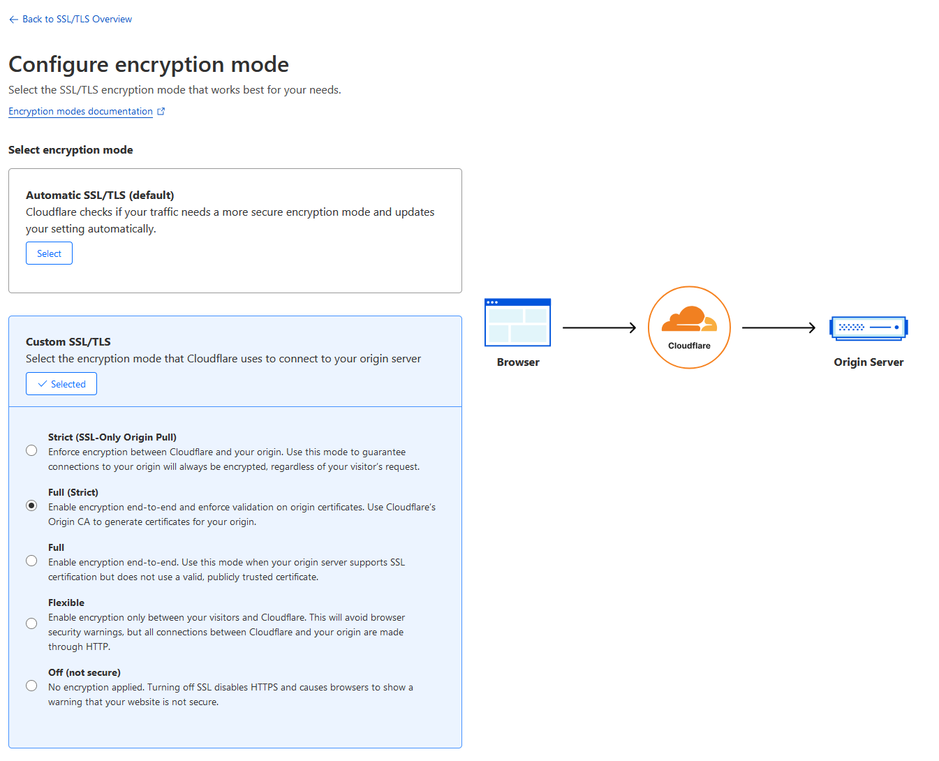 以下是cf的五种SSL/TLS Configure encryption mode,而我一开始选择的是Flexible mode